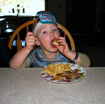 This was the first picture of the day on Kaden's birthday. We started off the wonderful day with his favorite breakfast: frozen waffles and sausage. He LOVES them. While it may not be a very healthy breakfast, he loves it, it's easy, so I love it.